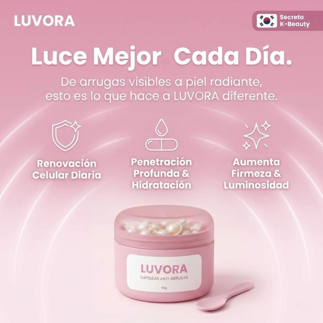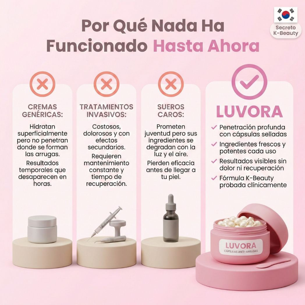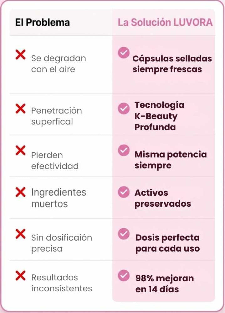 Las marcas famosas gastan millones en marketing y empaques lujosos, pero sus fórmulas sufren del mismo problema: ingredientes que se degradan en el frasco. LUVORA invierte en tecnología de cápsulas selladas que las grandes marcas no usan porque es más costosa de producir. Está respaldada por clínicas estéticas asiáticas que han usado esta tecnología durante años con resultados comprobados. Además, ninguna marca grande te ofrece 90 días de garantía porque no pueden asegurar que sus ingredientes mantengan potencia. LUVORA sí puede. Los resultados hablan por sí solos: 98% de satisfacción y +50,000 mujeres transformadas.