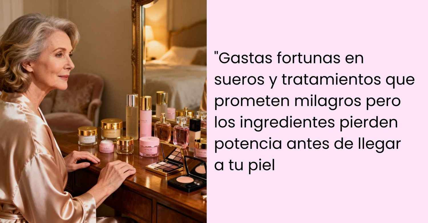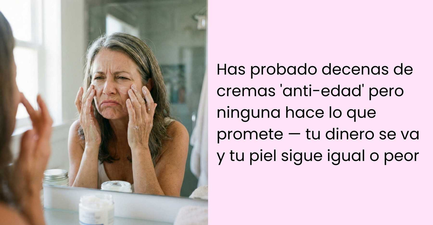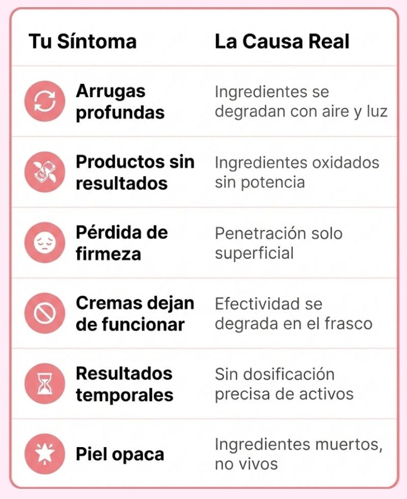 Estos no son problemas separados. Son todos síntomas de la misma causa raíz: tus cremas anti-edad están muertas antes de tocar tu piel.